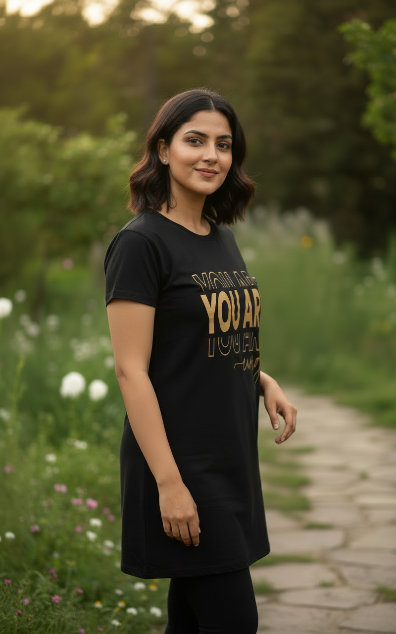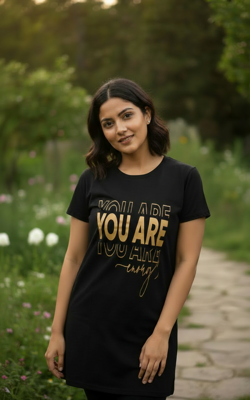 Design: "You Are Enough" bold gold-toned typography on a black base.